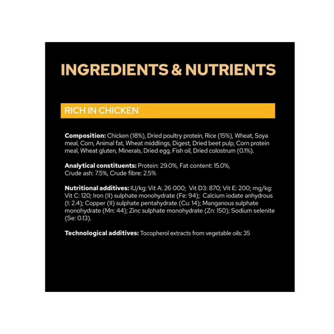 COMPOZIȚIE: Pui (17%), Grâu, Proteine din carne deshidratată de pasăre, Porumb, Orez (6%), Făină de soia, Grăsime animală, Fibre de grâu, Gluten, Digest, Pulpă de sfeclă deshidratată, Minerale, Ulei de peşte, Colostru deshidratat (0,1%)