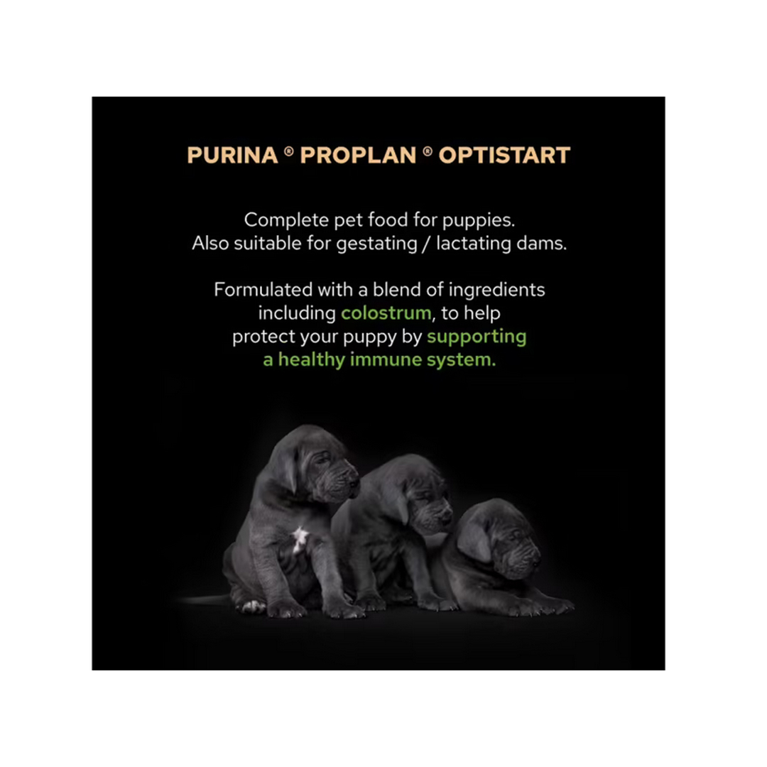 Primul an din viaţa câinelui dumneavoastră (sau primii doi ani pentru căţeii de talie mare) este crucial pentru sănătatea lui pe termen lung. Pentru a ajuta la întărirea sistemelor naturale de apărare ale căţelului, în scopul unui start optim în viaţă, medicii veterinari şi nutriţioniştii Purina au dezvoltat Purina PRO PLAN PUPPY cu OPTISTART. Având drept ingredient special colostrul - primul lapte matern bogat în anticorpi naturali - OPTISTART ajută la întărirea sistemelor naturale de apărare ale căţelului pentru a face faţă provocărilor zilnice
